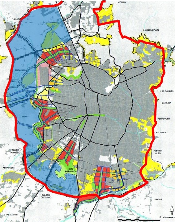 (1) Las superficie indicada fueron calculadas dibujando sobre Google Earth el área contenida entre la propuesta de la Orbital y la mancha urbana hoy existente de Santiago. No se consideró las 10:000 hectáreas propuestas del PRMS